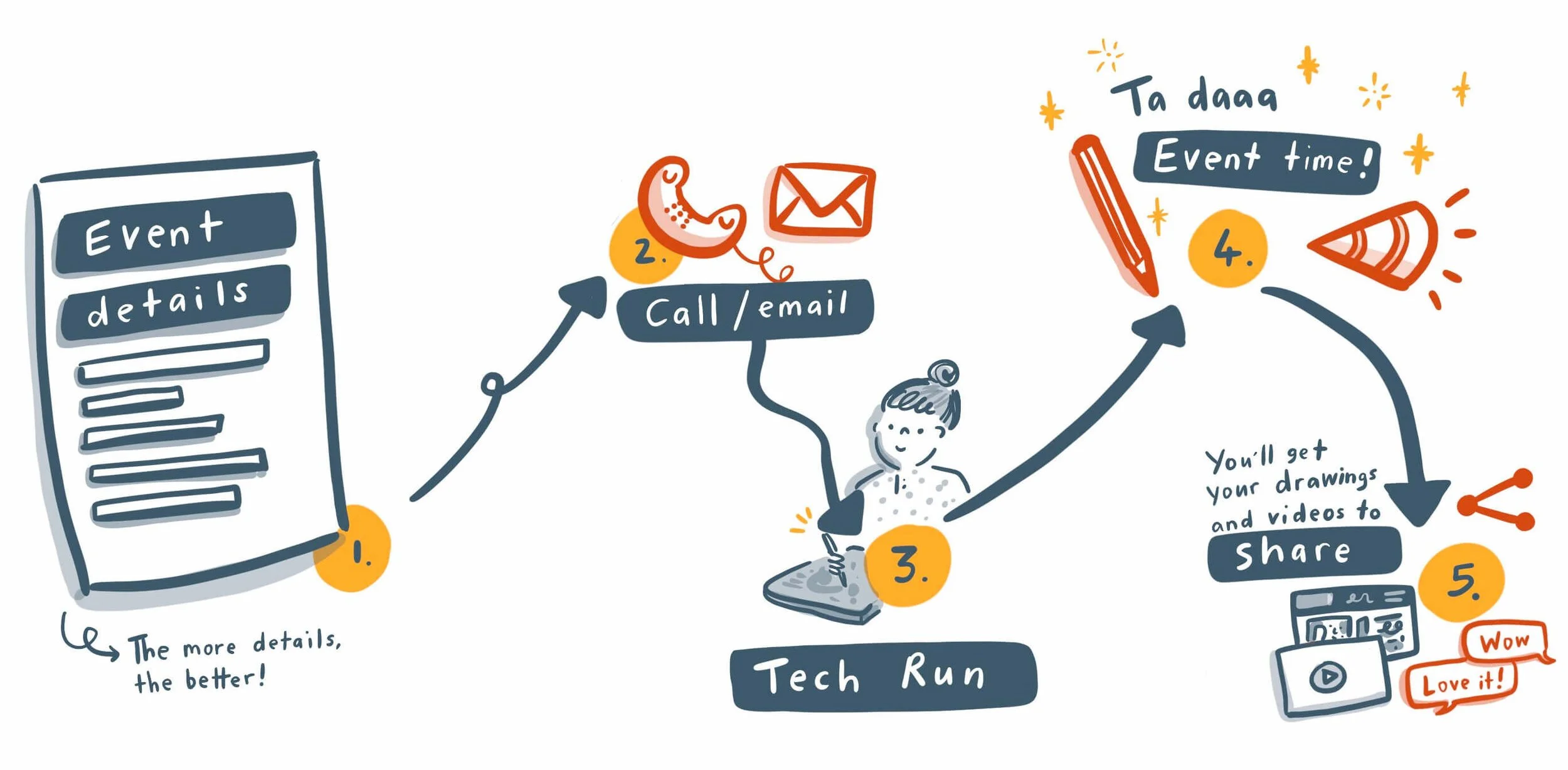 For non-live work, the creative process is pretty much the same… but instead of an event at the end, it’s your project deadline! We also add in some check-ins along the way to make sure your illustrations are spot on.